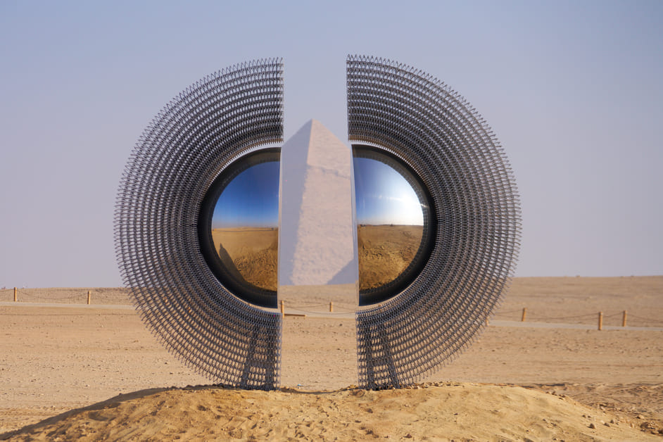 Le Piramidi, simbolo universale dell’eternità, accolgono linguaggi che si muovono tra scultura, installazione e spazio. Pistoletto intreccia nel Terzo Paradiso passato, presente e futuro come un unico atto creativo. Vhils scava nei portoni del Cairo le soglie che uniscono civiltà e generazioni. Mert Ege costruisce un anello di metallo che cattura la luce e lascia al vento il compito di raccontare il resto della storia.