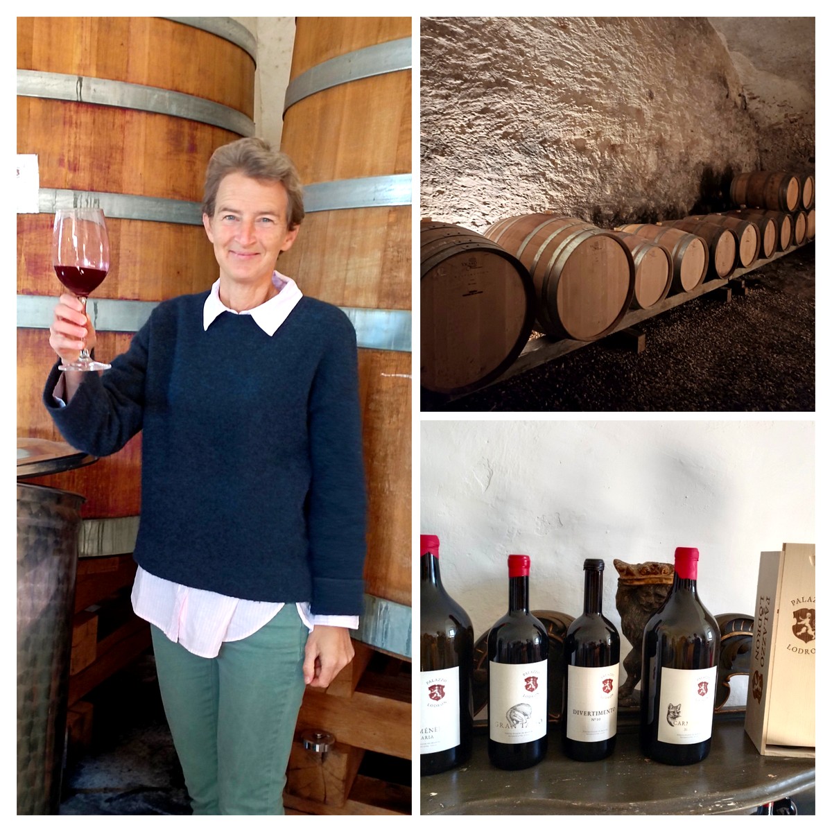 Sono due le cantine: quella superiore, proprio accanto al vigneto, dove il mosto viene pompato nelle grandi botti. L'uva non viene pigiata, il delicato sgocciolamento del succo previene le sostanze amare. La fermentazione inizia immediatamente e pochi giorni dopo proseguiamo nella cantina profonda due piani sotto il Palazzo al livello delle fondamenta dove massicce mura testimoniano un passato castellano che risale al Medioevo.
