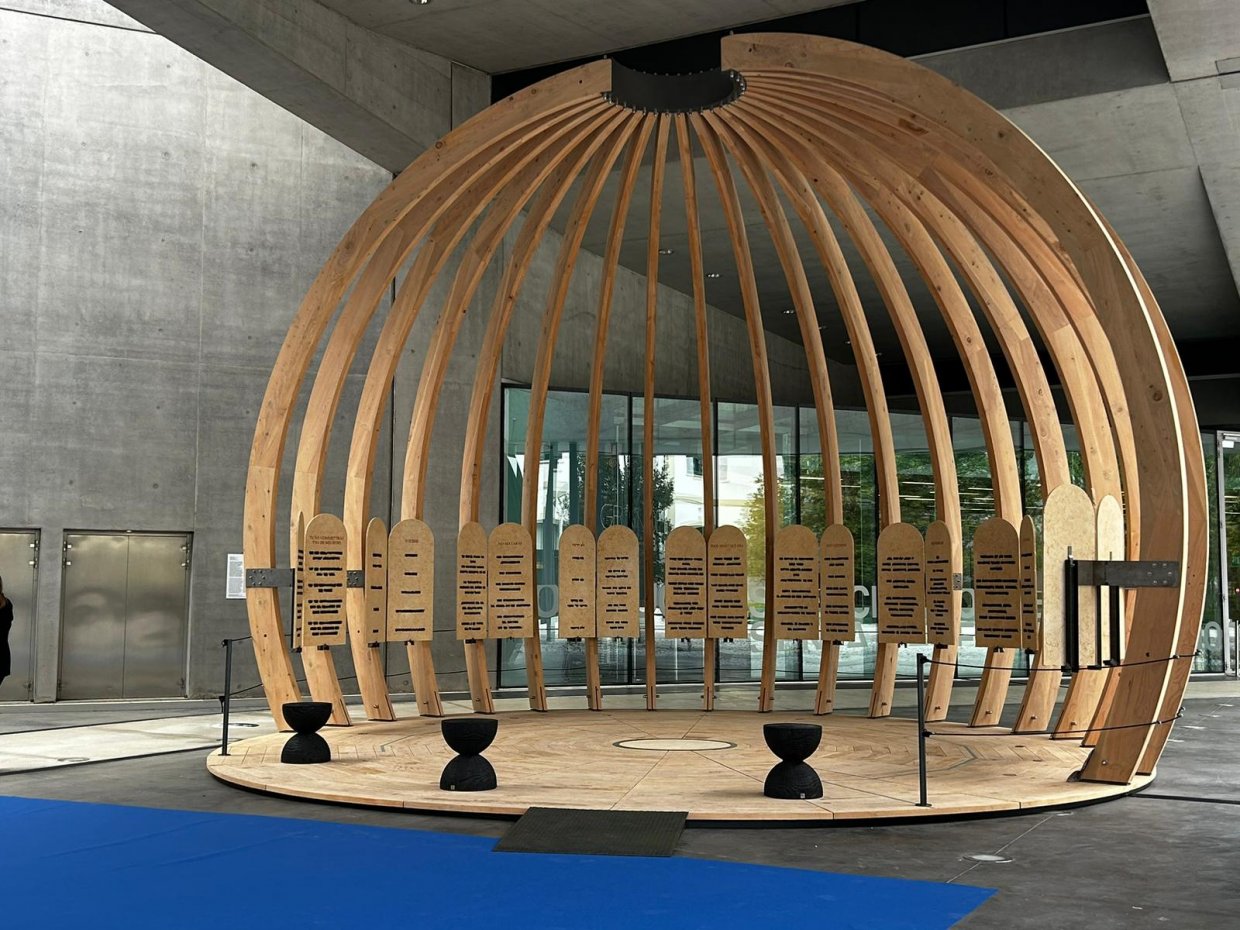 ''Non uccidere'' è composto da una grande opera di Emilio Isgrò, un monumentale bassorilievo in pietra del Sinai articolato in undici elementi che rivisitano le tavole bibliche dei Dieci comandamenti, e da una spettacolare architettura in cedro del Libano progettata da Mario Botta.