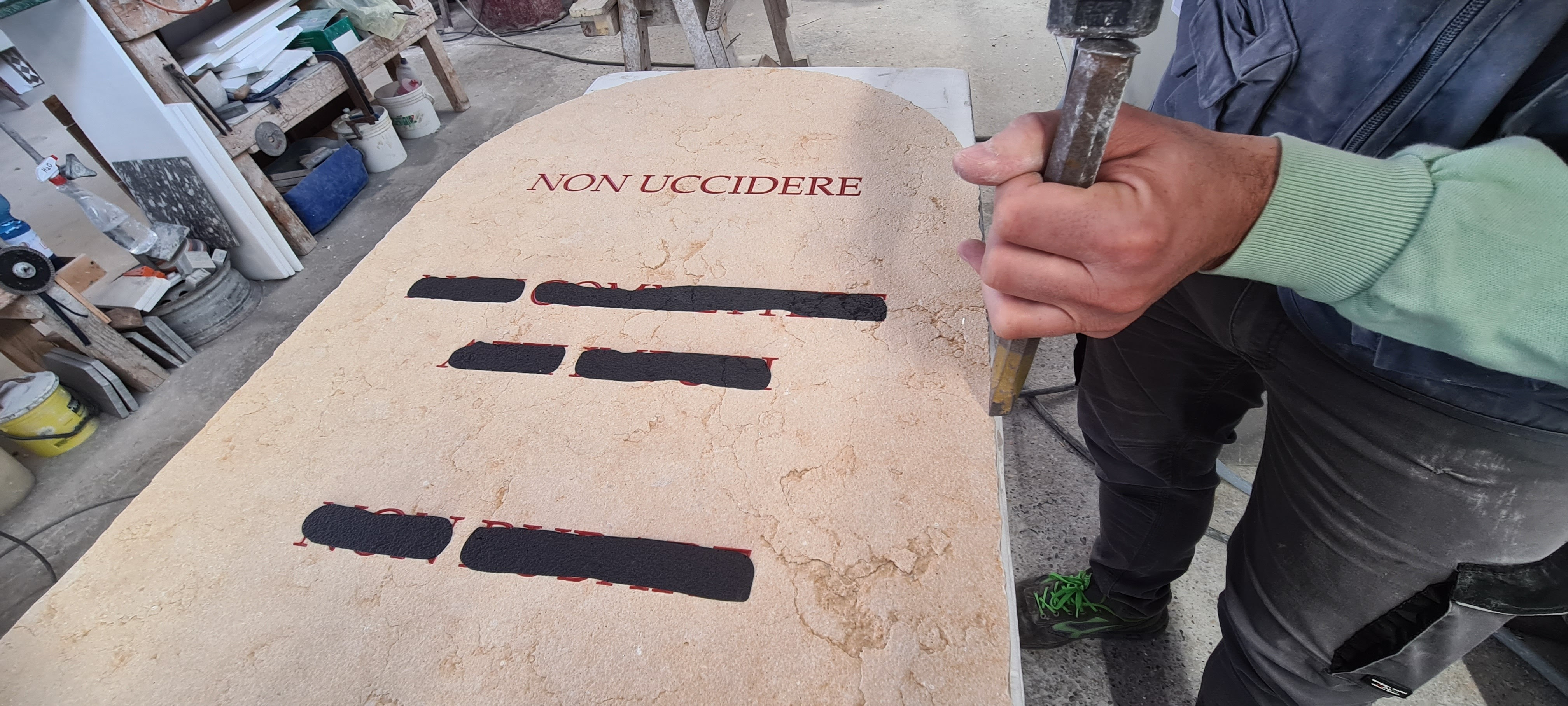 Emilio Isgrò interpreta il tema della Costituzione riflettendo sui princìpi di convivenza sociale alla base di tutte le carte costituzionali. I comandamenti, incisi in rosso in undici lingue sulle imponenti tavole in pietra, sono cancellati da Isgrò lasciando emergere un unico monito: non uccidere.