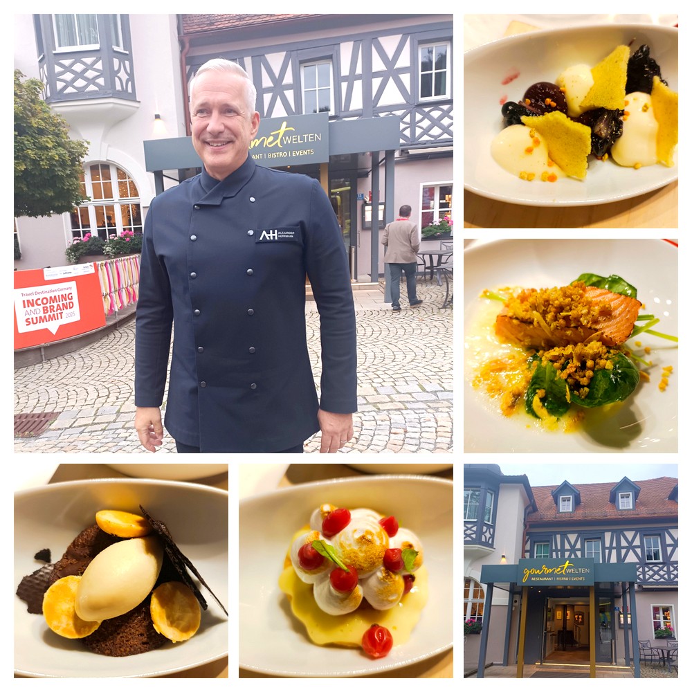 Tra questi c'è il nome più noto della cucina germanica, volto della tv tedesca, autore di successo di numerosi libri: lo chef stellato Alexander Hermann. Al numero 11 di Markplatz a Wirsberg nel ristorante Aura del Posthotel, cucina divinamente piatti di carne e pesce sempre introdotti da appetitosi e irrinunciabili starters. E a tavola che stile! Anche nei bicchieri per l'acqua, ma è la simpatia di Alexander ad essere esplosiva! Germany Tourism lo ha scelto non a caso per rappresentare il meglio della Germania culinaria al suo Brand Summit Travel Destination 2025.