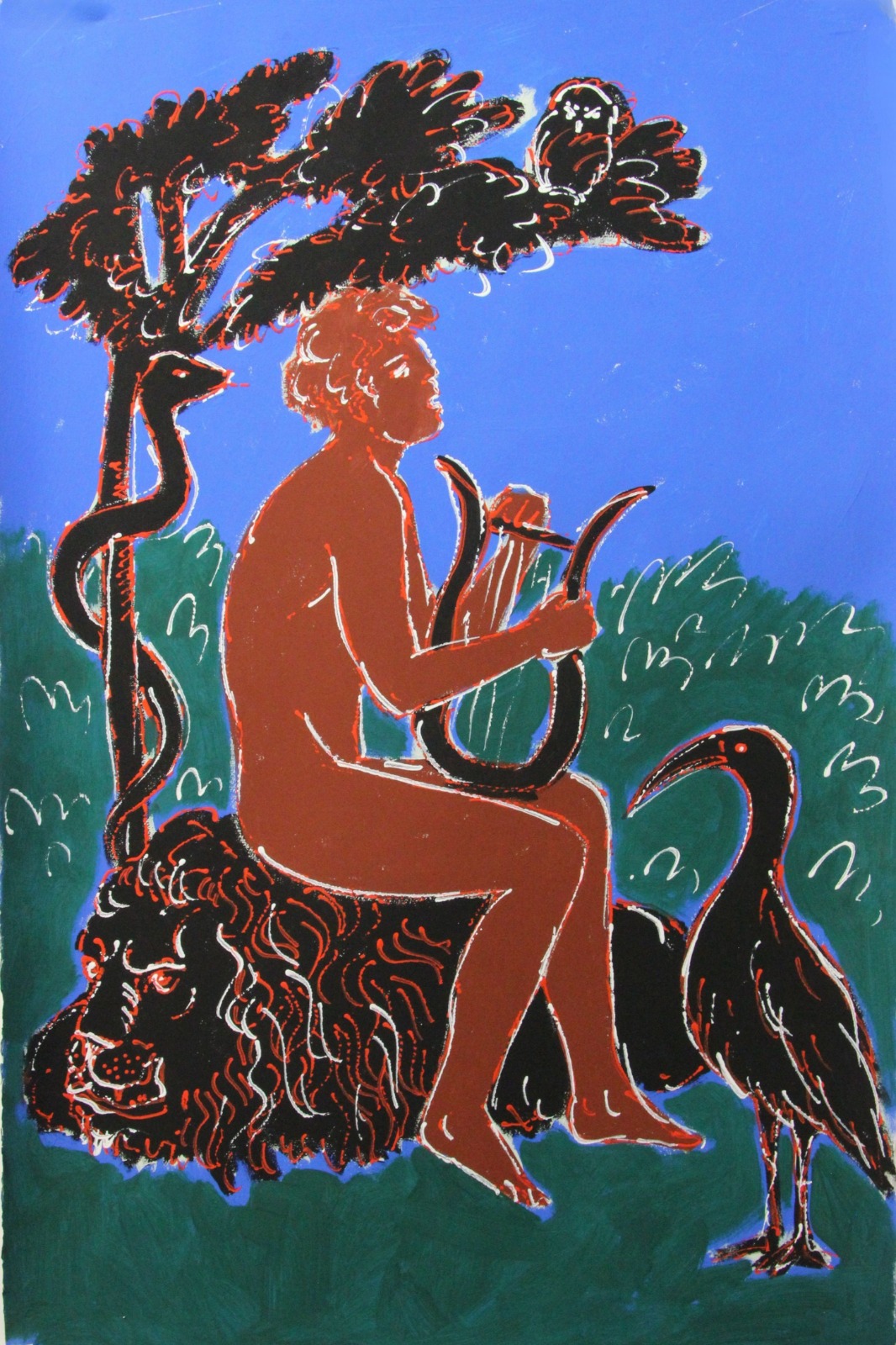 Immerse nella natura, le figure di dei, semidei, ninfe ed eroi, sintetiche e vibranti come le silhouette delle pitture vascolari greche, esalano echi pop. I colori saturi e sgargianti delle tempere viniliche, stesi à plat ma inscritti in contorni bianchi e rossi dal segno vibrante e nervoso, a effetto dripping, animano corpi umani e animali – civetta, serpente, ibis, leone – come anche zufoli e cetre sparsi fra la vegetazione, attualizzando scenari da idillio arcadico e acuendo la trasversalità dei messaggi.