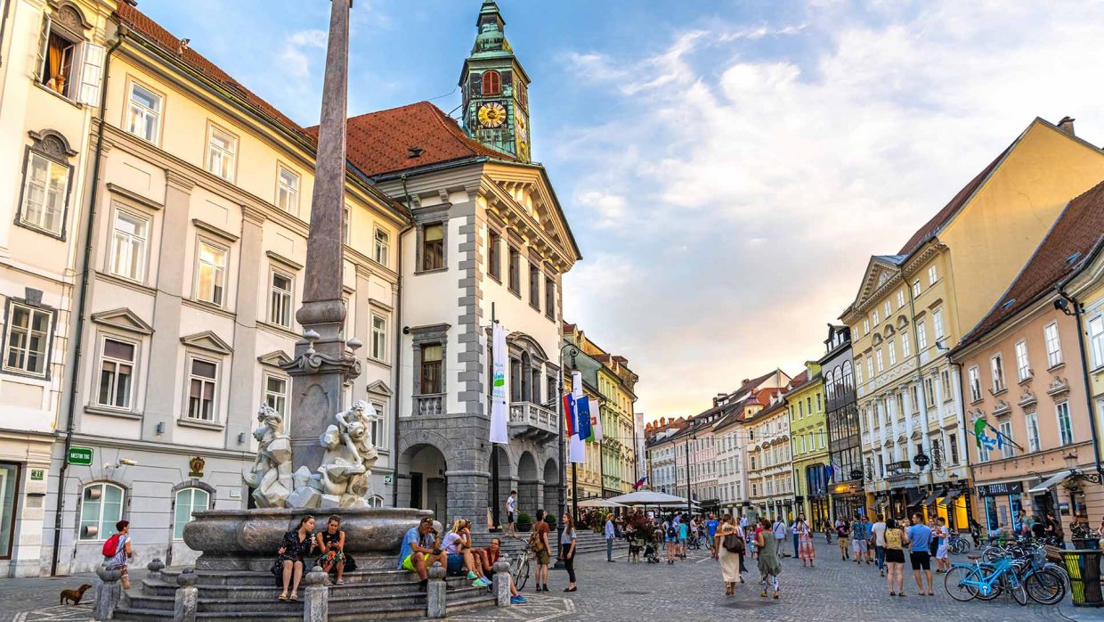 Lubiana è grande e piccola allo stesso tempo. Bastano pochi passi per arrivare nella suggestiva Piazza civica (Mestni trg) in quella che è la Lubiana medievale anche se molti edifici sono di matrice tardo rinascimentale-barocca e tra questi il Municipio dove si può vedere un magnifico cortiletto interno che sembra ricamato in stile veneziano. Tra i fregi compare il drago simbolo cittadino. Di fronte al Municipio si trova la Fontana dei quattro fiumi carniolani, opera dello scultore italiano Francesco Robba. E' il corso più bello e scenografico: belle botteghe storiche, caffè all'aperto, eleganti negozi: l'atmosfera è quella di una città europea che pur essendo capitale ha mantenuto una vivibilità straordinaria.