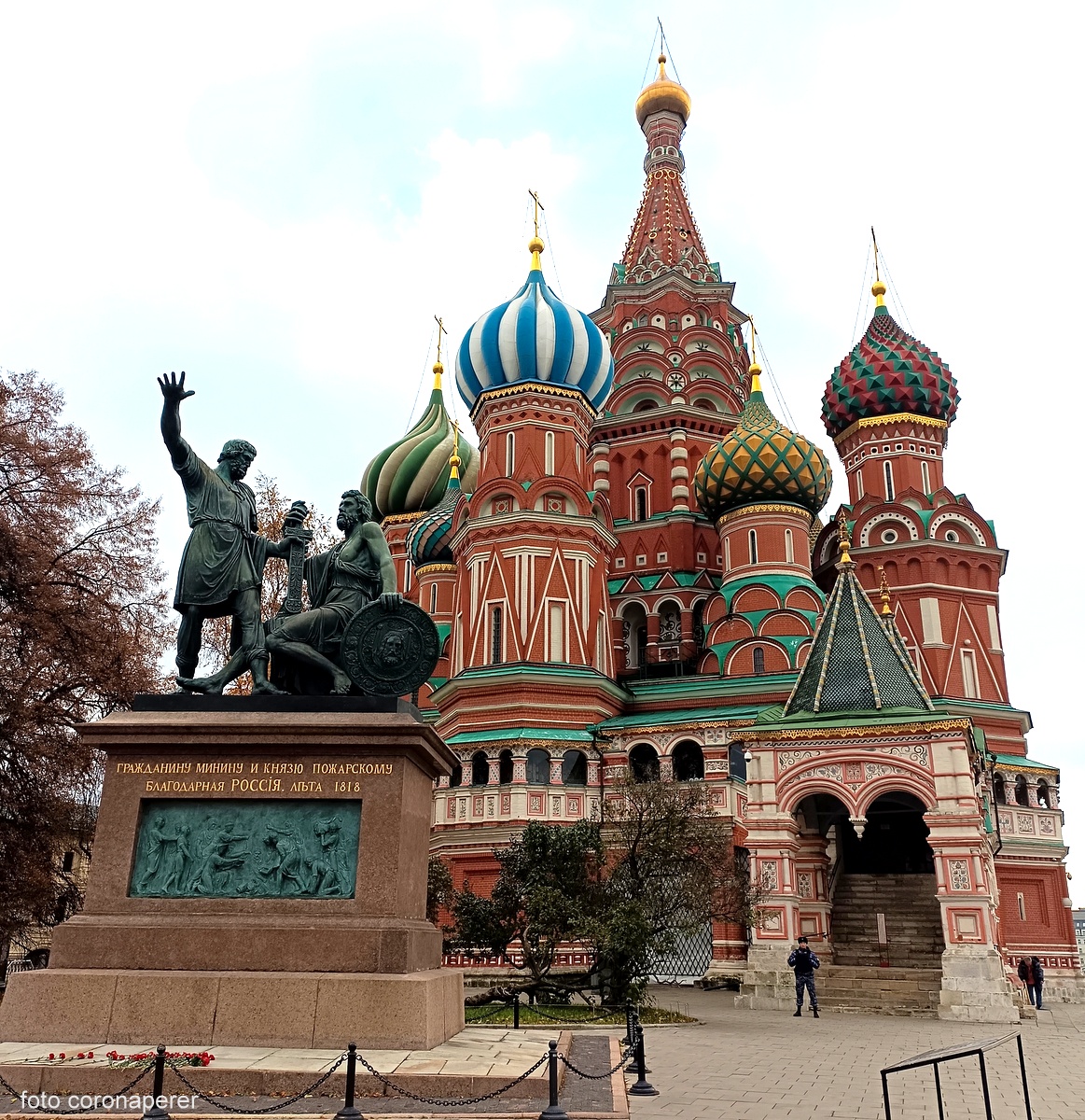 Davanti all'ingresso principale presidiato da un poliziotto che sembrava stancarsi dei nostri continui scatti, c'è il monumento ai due eroi nazionali russi Kuz'ma Minin e al principe Dmitrij Michajlovič Požarskij, eretto per ricordare la liberazione di Mosca dalle truppe di occupazione polacco-lituane nel 1612, alla quale l'esercito popolare guidato da Minin e Požarskij fece un contributo decisivo. Il monumento in bronzo, che pesa 20 tonnellate, ed è stato finanziato interamente da donazioni dell'epoca, è stato progettato dallo scultore Ivan Petrovič Martos. Ci vollero 15 anni tra progettazione e costruzione, fino a che nel 1818 fu inaugurato.
