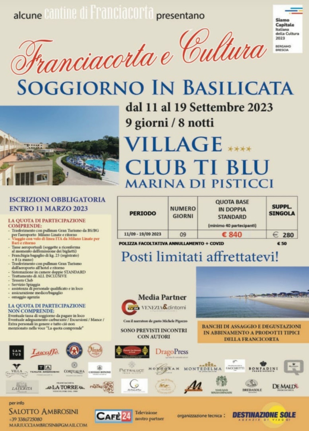 E poi i viaggi. L'ultimo in ordine di tempo riguarda la Basilicata dove i vini Franciacorta saranno proposti a settembre 2023 in banchi d'assaggio e, in vista di Brescia Bergamo capitale italiana della cultura, si lavorerà all'incontro con scrittori lucani e pugliesi, creando, durante il soggiorno, momenti culturali oltre che enogastronomici.