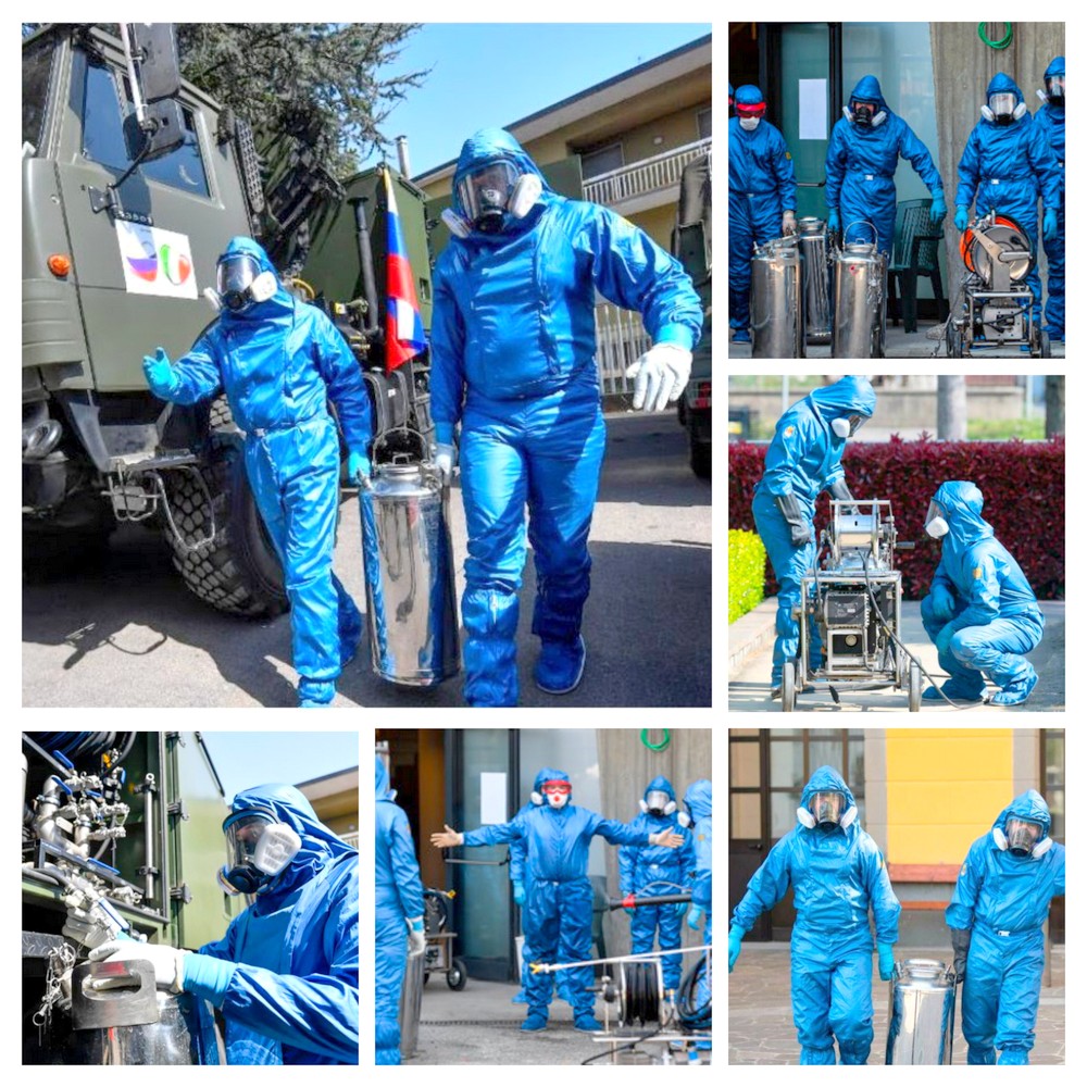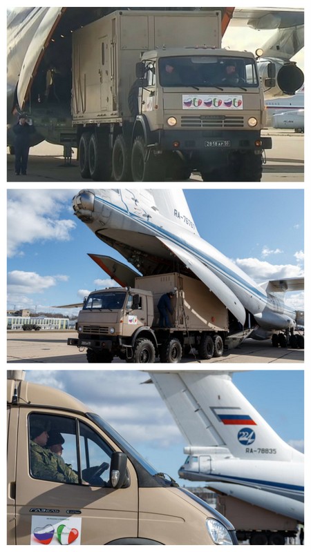 Nel marzo 2020 arrivarono dalla Russia 14 aerei militari, con capacità di carico fino a 60 tonnellate con medici, infermieri e addetti alla sanificazione, attrezzature mediche e presidi di protezione. I 32 sanitari militari furono distribuiti su 8 equipe composte da anestesisti, virologi, infermieri, accompagnati da interpreti e squadre in grado di sanificare anche condutture idriche. Il sostegno russo fu messo in campo anche con 30 unità di mezzi speciali, ciascuna composta da due veicoli, e moduli di elaborazione dati installati su veicoli dedicati che operarono nelle aree del nord Italia più colpite dal Covid-19. Furono forniti ventilatori polmonari, macchine per effettuare analisi biologiche, mascherine sanitarie ad alta protezione, guanti e completi di protezione. In particolare, è stato messo a disposizione dell’Italia un laboratorio chimico che in Russia è utilizzato per le operazioni di difesa nucleare, batteriologica e chimica, unità mobili per la disinfezione dei mezzi di trasporto e del territorio.