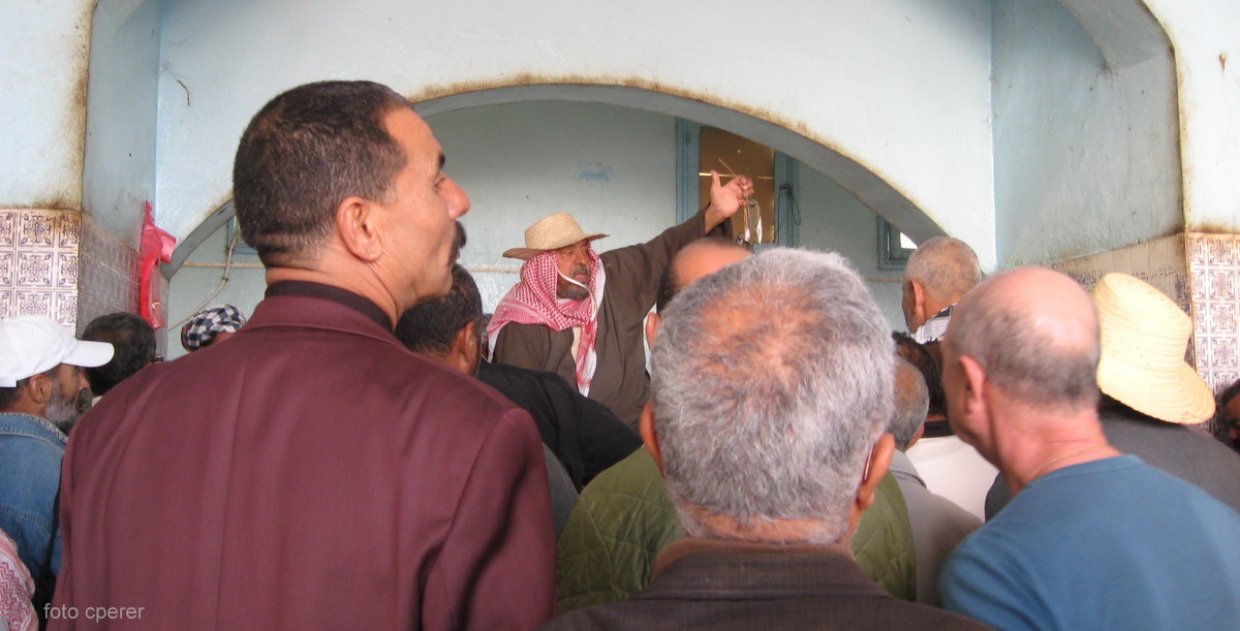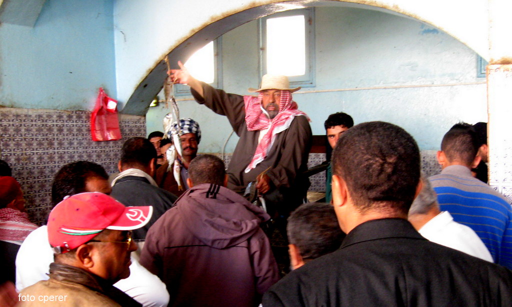 Siamo in uno dei mercati principali e tipici del pesce tunisino nel centro principale di Djerba ad Houmt-Souk dove si tiene l'asta mattutina del pesce. Uno spettacolo imperdibile: attorno al trono sul quale siede il mercante si muovono gli assistenti che mostrano le collane di pesci.